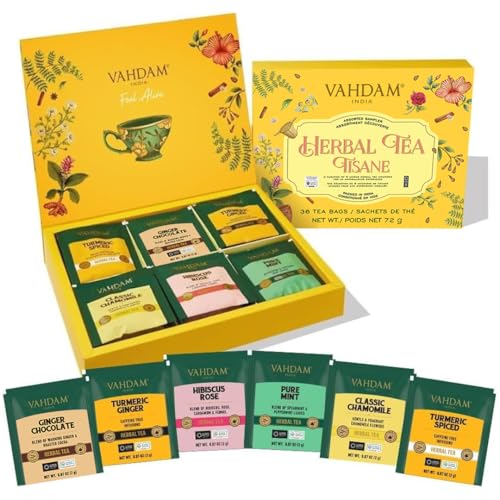 VAHDAMDive into this VAHDAM Herbal Tea Variety Pack, featuring six unique, caffeine-free blends. Each eco-friendly pyramid teabag offers a distinct, soothing experience, perfect for any tea lover looking to unwind!